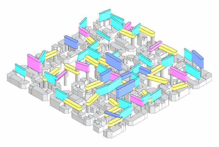By overlaying two coordinate systems on top of each other, one for the towers and one for the bridges, specific relations between the two can be defined. E.g. a tower can use the displayed formulas to check for the adjacent bridge’s parameters and define its geometry by doing so. As the coordinate systems are evenly overlaid, the formulas are the same in each direction and at each point in the system. A tower will be as thick as the thickest bridge connected to it and go up as high as the bottom of the highest bridge connected to it. The context informs the setbacks for the towers. They can thereby be placed at a location where they would have the least impact on the existing built environment.