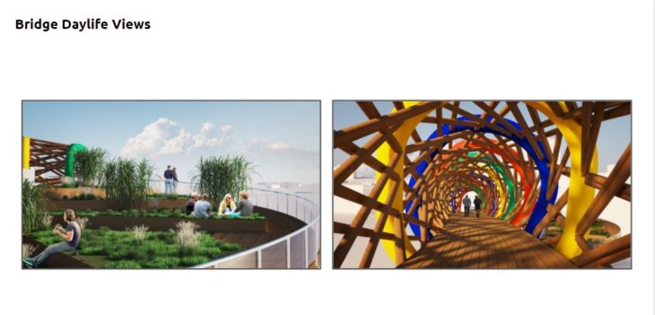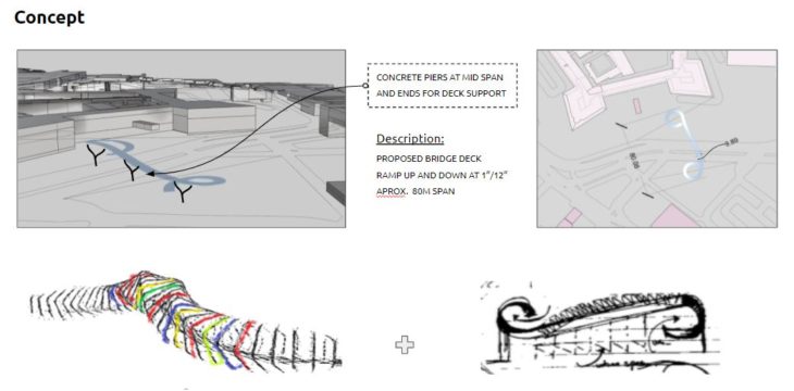 The purpose of Bridging the Gap project is creating a bridge structurally optimizes connecting the two sites to connect the colonial past to an inclusive future and bring back traditional motifs in urban infrastructure, concrete piers at mid span and ends for beck support, proposed bridge deck ramp up and down at 1”/12” Approx. 80m Span