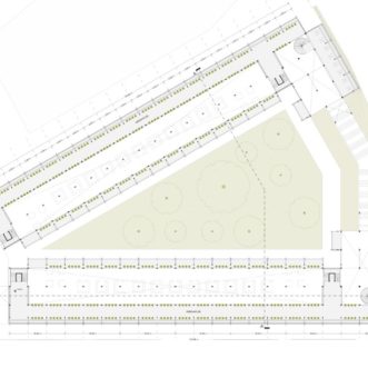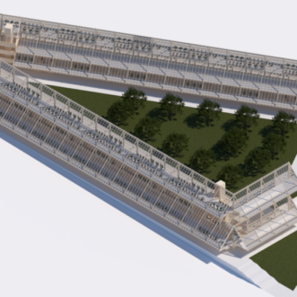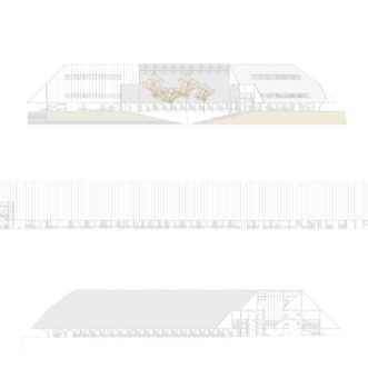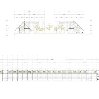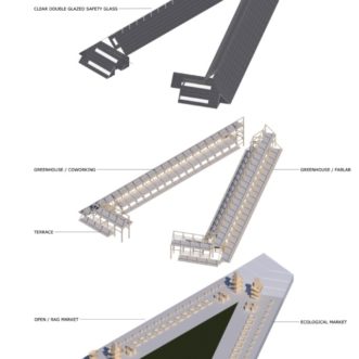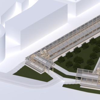 A double-glazed transparent safety glass envelope covers the entire solid wood structure. With a steep double slope, the climate of the city and the months of snow are taken into account, to take advantage of the water both in the greenhouses and in the central green area. In the same way, solar glass windows can eventually be installed to take advantage of solar energy and allow light to enter the greenhouses.