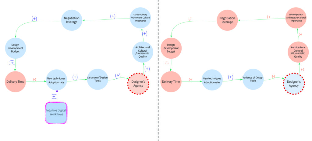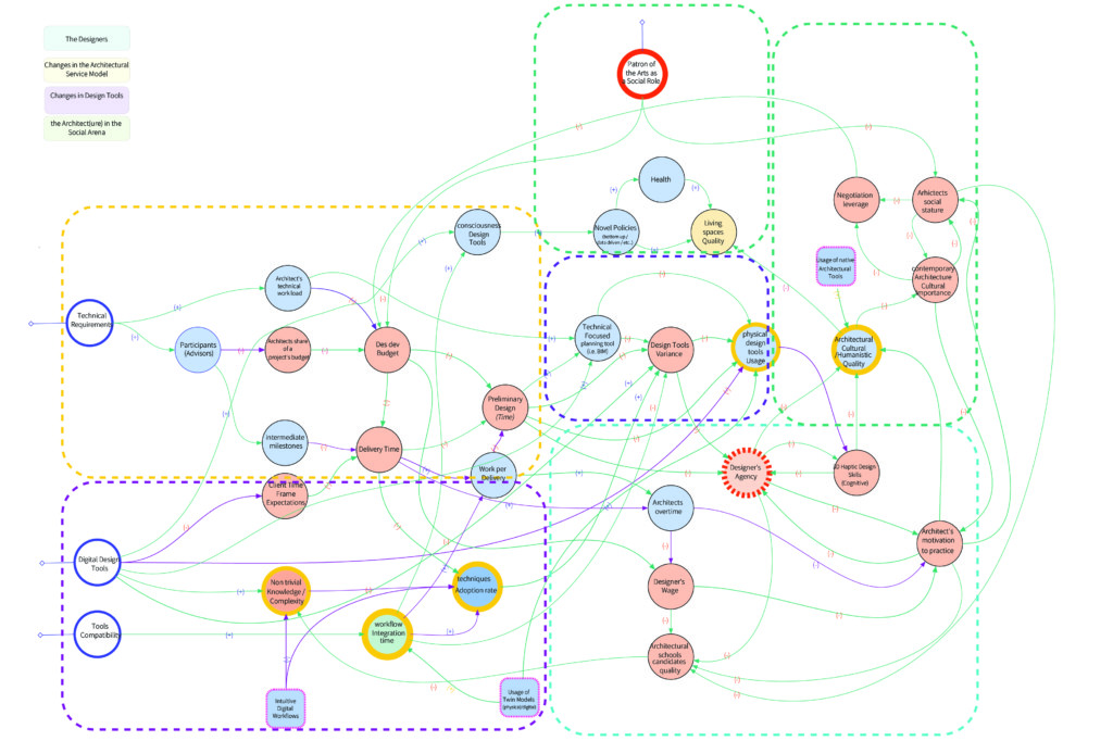 Mapping a map extending from the designer’s Agency, can point at a deep connection between the architectural design practices, the changes in the architectural service models, and cultural aspects in the profession and the architects place in society.