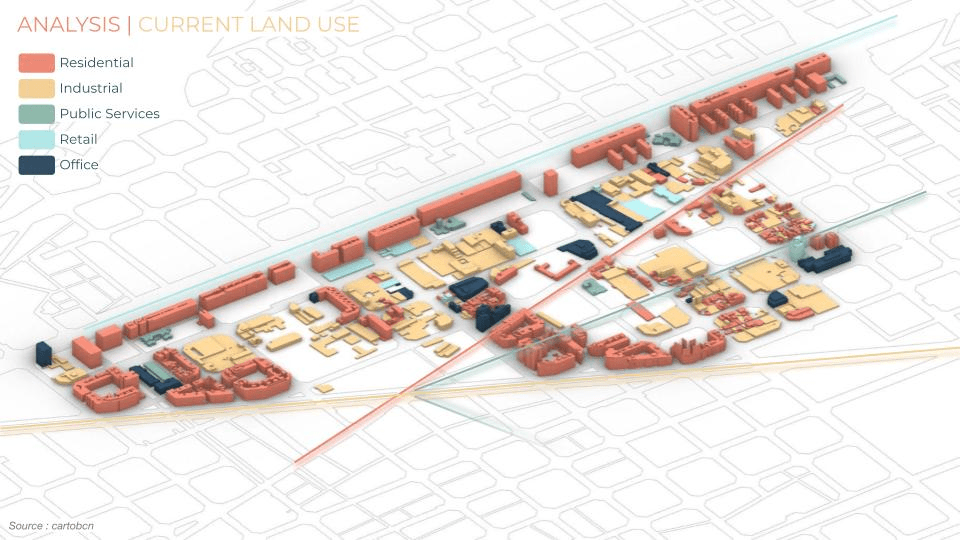 Analysis of the land use shows the extensive planning changes involved in the 22@ plan. The many disused industrial plots are being redeveloped into commercial office and retail space, cultural destinations, and new housing. Importantly, Provençals is home to many Fabricas (factories converted to new uses), schools, galleries, and museums. These elements anchor the arts community and play a central role in the design strategy below.
