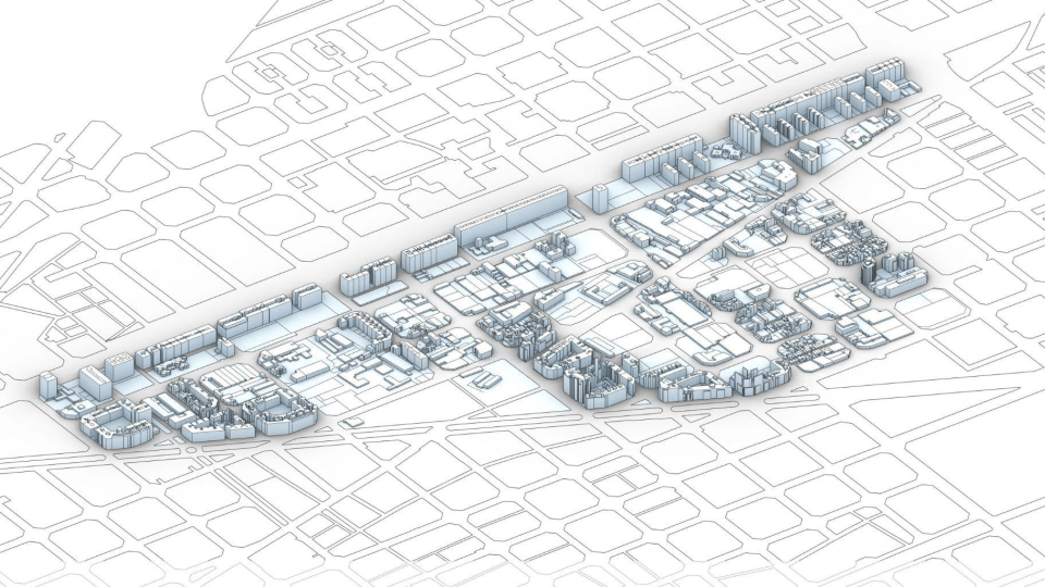 Historical timelapse of the urban form. Notice the street, called Pere IV, that runs diagonally. It emerges early on and becomes a primary axis through the center of the neighborhood.