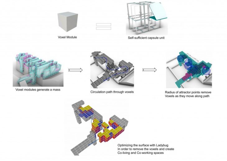 CONCEPT The project starts with a voxels' population placed on top of the existing buildings. These voxels represent self sufficient capsules. A circulation path is designed to run through the mass, and repulsion points are generated on it. These points remove voxels from the total mass around them, creating open public spaces. The rest of the voxels touching the circulation path, are considered closed public spaces (co-working areas), represented in magenta colour, whereas the cyan voxels are residential areas. Next step is to run a ladybug sunlight hours analysis for the faces of the voxels surrounding the open public spaces.