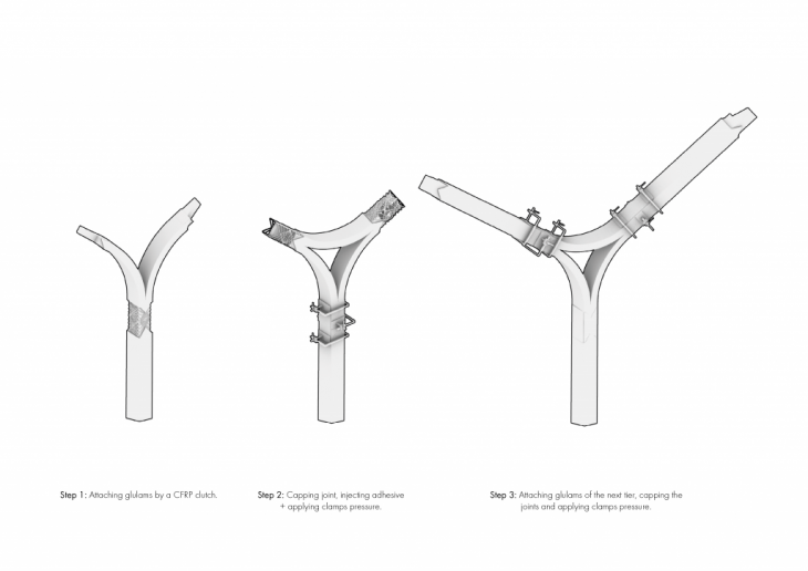 The proposed sequence includes following several steps, such as positioning the glulam and placing the CFRP “clutch”. After this, the glulam of the next level is positioned, and both glulams are stitched together with CFRP threads. When the wooden caps are attached to the structure, the clamps are placed and the epoxy is injected.