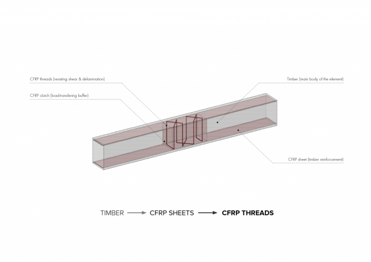 One of the key features of the proposed joint is this idea of a “reinforcement gradient”. This idea significantly improves the connection between wood, adhesive, and CFRP. Normally, carbon fibers under high stress can cut through wood with ease. Therefore, the load in the proposed joint is gradually transferred through the softwood to a harder CFRP “clutch” and to the hard carbon fiber threads. Consequently, the proposed design can perform under much higher loads, without breaking or losing its’ properties.