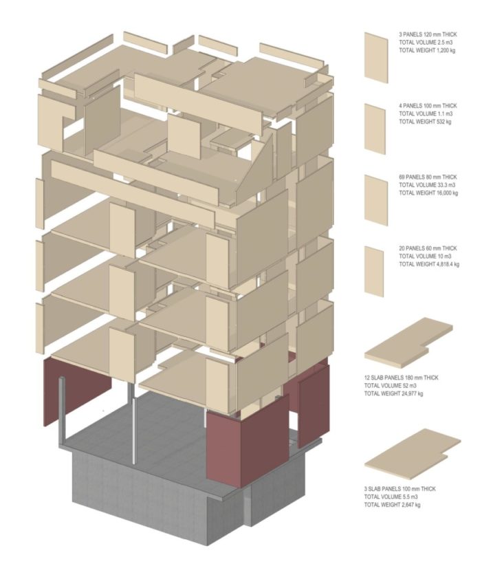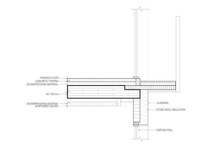 The building uses high quality assemblies to achieve greater thermal and acoustical insulating values, the CLT vertical panels have a furring wall with an insulated cavity. The CTL bearing walls were designed to have different thicknesses thus optimizing the structural elements and reducing the construction costs.