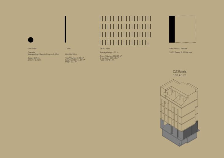 The material ecology analysis results describes how only roughly seventy eight trees were needed for this building, the previous figure represents only one fifth of and hectare in a timber plantation.