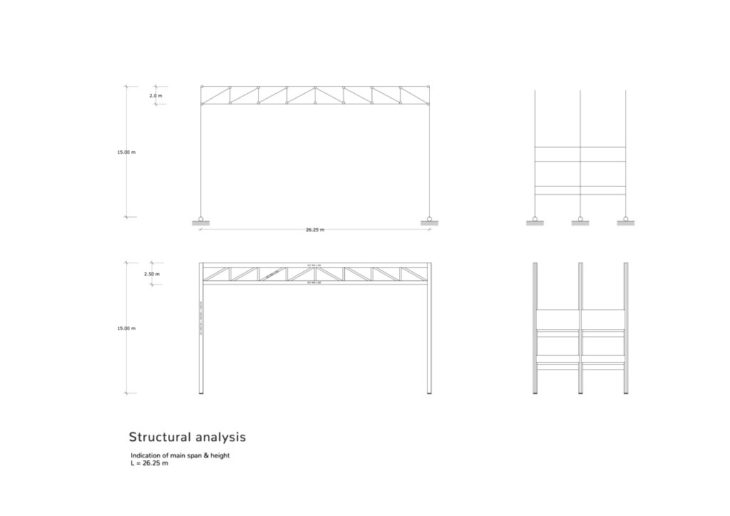 The structure of the building was analyzed in another course of the third module of the MMTD. From such analysis the following was concluded: the trusses spans are both 26m and are pinned-joined to the supports. Turo de la Peira’s Truss System is a standard howe truss with timber compression diagonal with a slendernesses L/13. For cross bracing stiffening CLT panels are used.