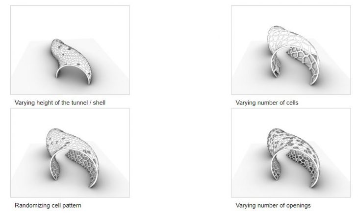 The main criteria of the design,and thus the main focus of this exercise, was to create a tunnel with Cells/ honey comb pattern with random openings on the panels.