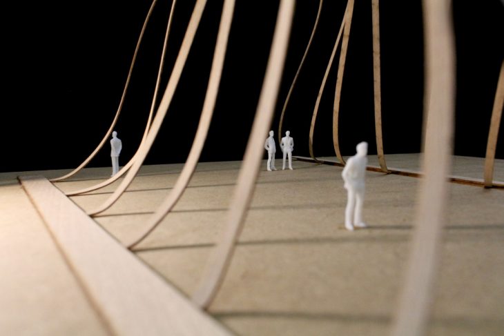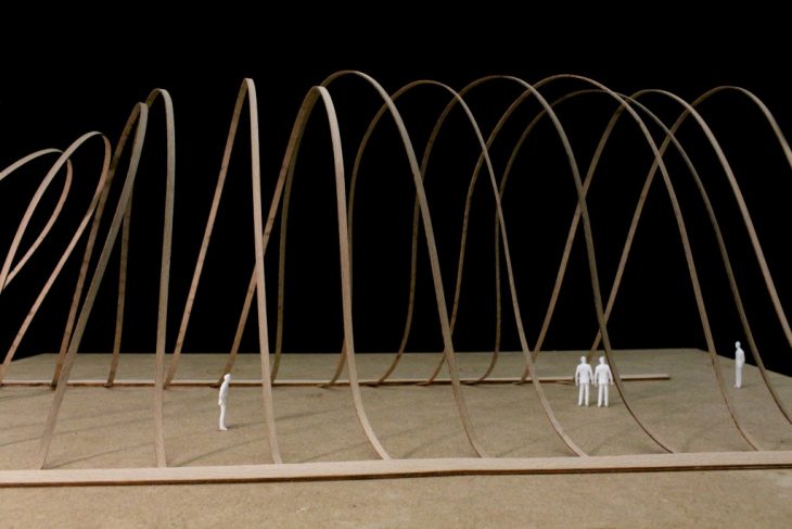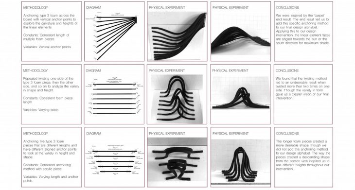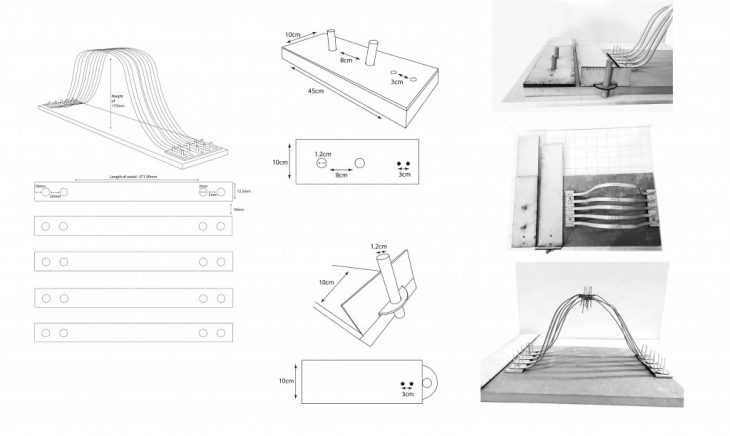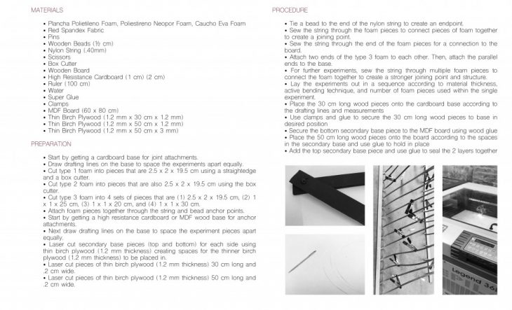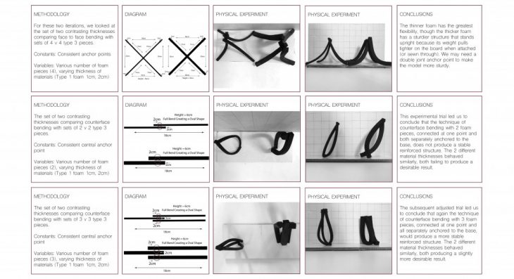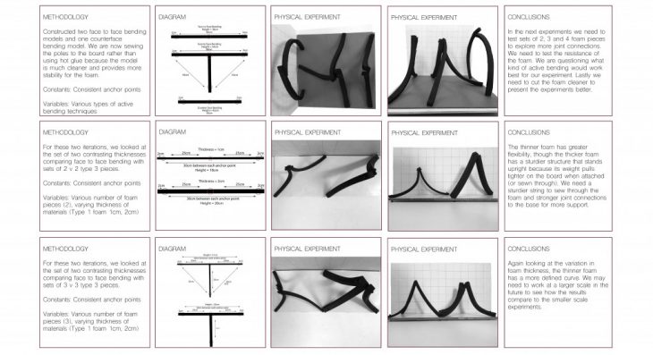 The group run a series of experiments, using different types of foam and wood, exploring the possibilities of active bending, while optimizing the anchor point joinery for maximum stability. The process was focused on linear elements and the form that derives from the different angles and positions of their anchor points.
