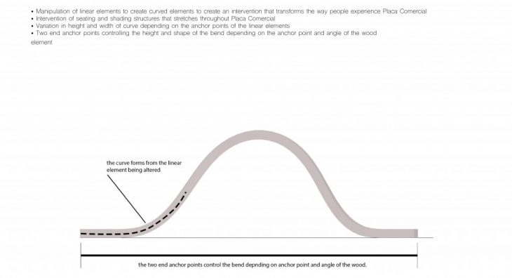CENTRO DE CULTURA CURVA is project that explores the application of wood active bending in temporary architecture. Active Bending is a form finding process in which the manipulation of the geometry and positioning is reliant upon the flexible material behaviour and the rigid connection of the structural elements to specific anchor points. The achitectural intervention proposed is designed for city engagement, offers a variety of cultural and artistic events and aims to provide additional seating and shading for the visitors of Plaza Commercial, where it is located.