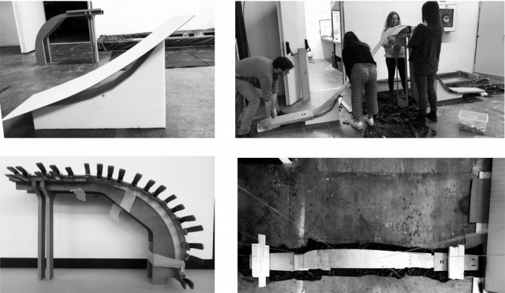 By the end of the project, the students we able to develop one linear bent element out of thin plywood in scale 1:1. In order to achieve this goal, they went through a series of experiments with wood bending in multiple scales and with various types of wood. The joinery of the linear element to the base was one of the major issues resolved during the 1:1 scale fabrication.