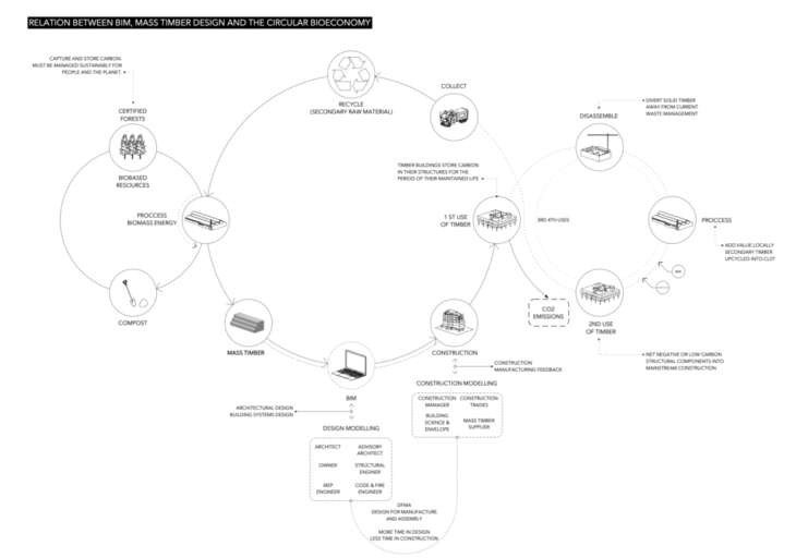 The relationship between BIM, MTD and the Circular Bioeconomy on a representative diagram of the Circular Bioeconomy, incorporates the BIM process and the M.T. in the flow. First the Certified Forests works as a biobase resource, which capture and store carbon. These have to be managed sustainably for the people and the planet. This raw material is processed in Mass Timber, which will be incorporated as a material in the architectural design elements and in the construction design system.