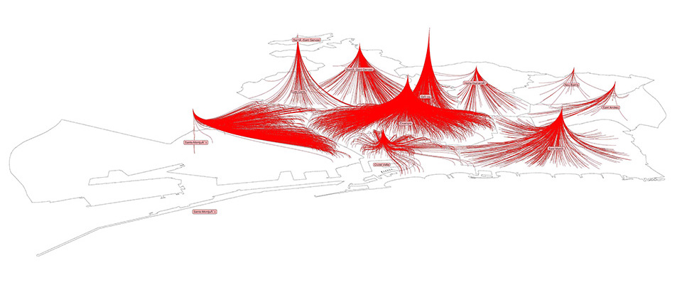 Sectoral income distribution from .csv file needed to be amalgamated in order to generate district level average income data. Elevation of converging points represent level of average income of residents. Higher density of touristic residential activities appears to be directly proportional to recorded income generated by residents of Barcelona.