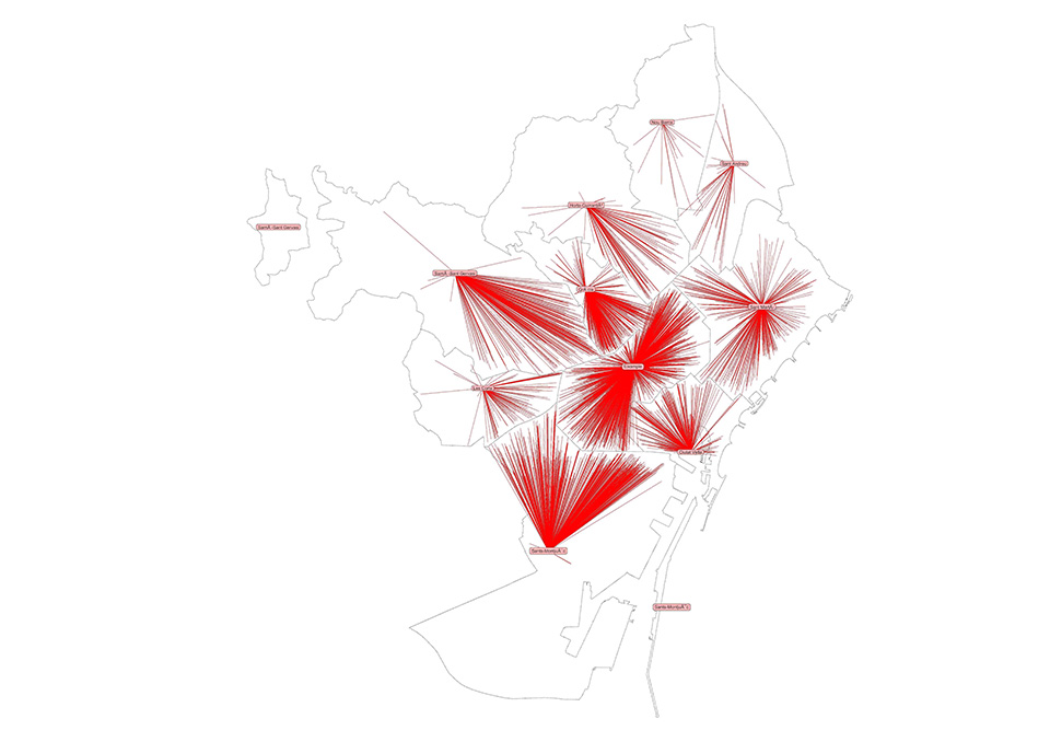 Higher density of radiating tourist housing locations in Barcelona from center of districts indicate higher touristic residential activities within the district.