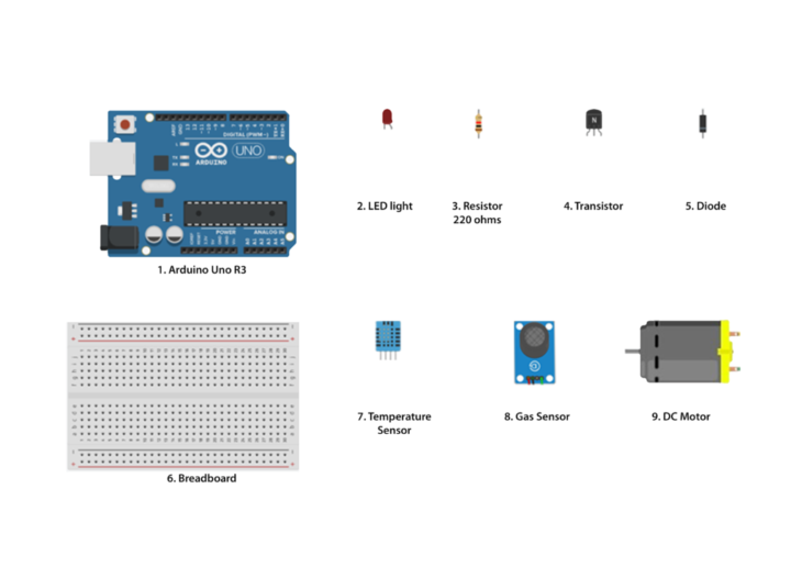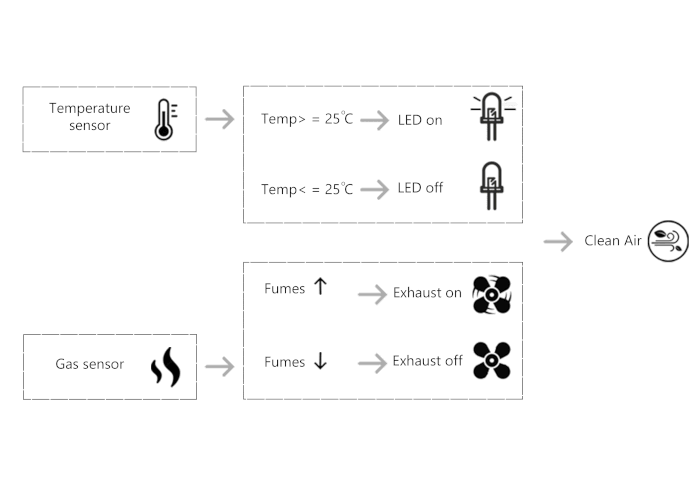Gas sensors are used to detect any toxicity present in the air. This will automatically provide an input to the DC motor to run. Simultaneously, if the temperature of the room, detected by the DHT11 sensor, rises beyond a certain value, an input to the LED light bulb is provided.