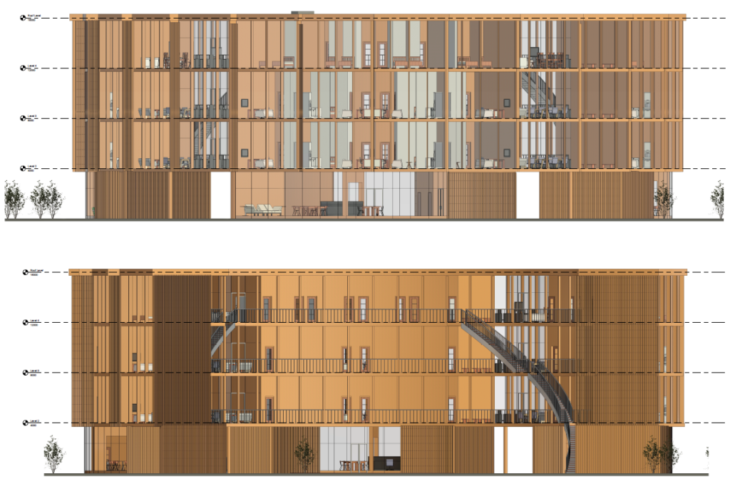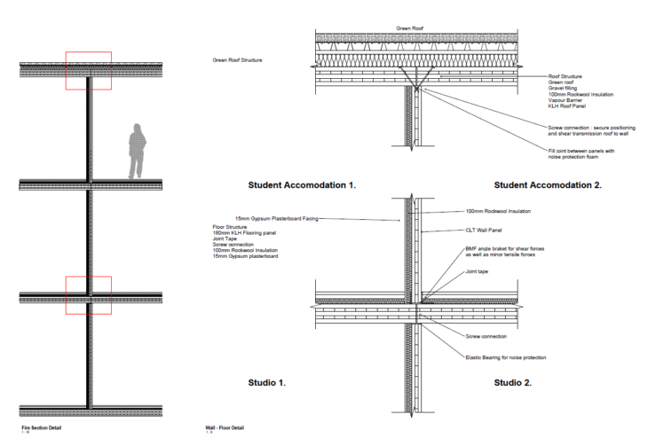 Fire protection must be properly assessed in a large scale mass timber project. The fire must be prevented from spreading between apartments and different levels for a given amount of time to allow occupants to successfully escape. All primary structural walls must be adequately fire protected to prevent fire spread throughout the structure.