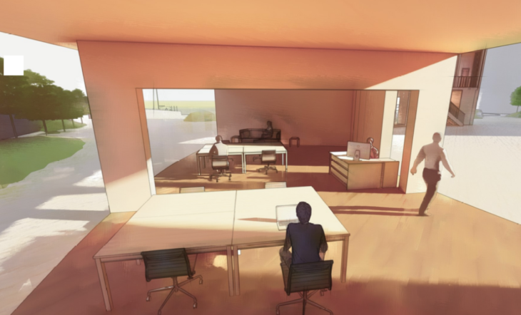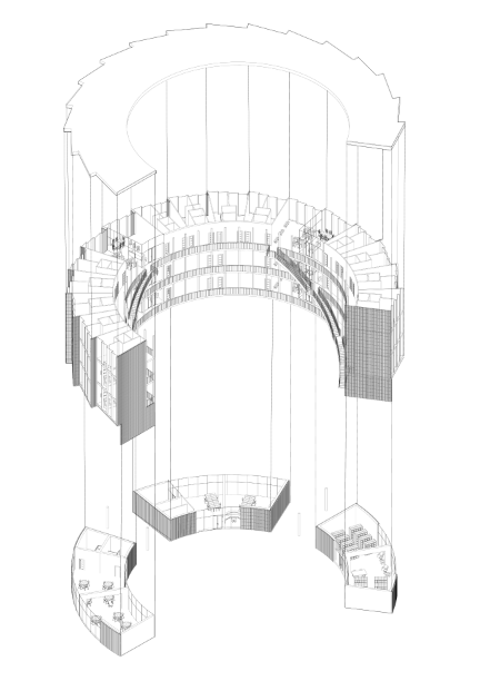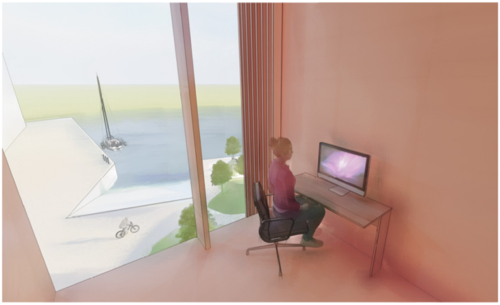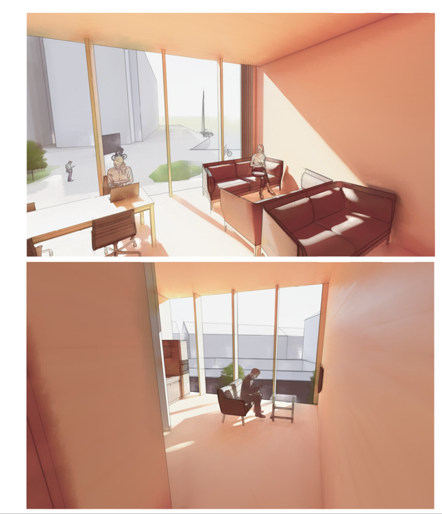There are 13 studio apartments on the first and second floors to accommodate working professionals who will work in the nearby IFC district. Each apartment is equipped with a bathroom with shower facilities, a desk to allow occupants to work from home and a small kitchen and seating area. The façade will act as a French balcony and slide open to allow for occupants to open up their apartments to the surroundings and create the feeling of a much larger space. Each floor accommodating the working professionals possesses two co-working spaces that will provide the occupants with a bright inviting space to work should they want to work outside their studio accommodation.