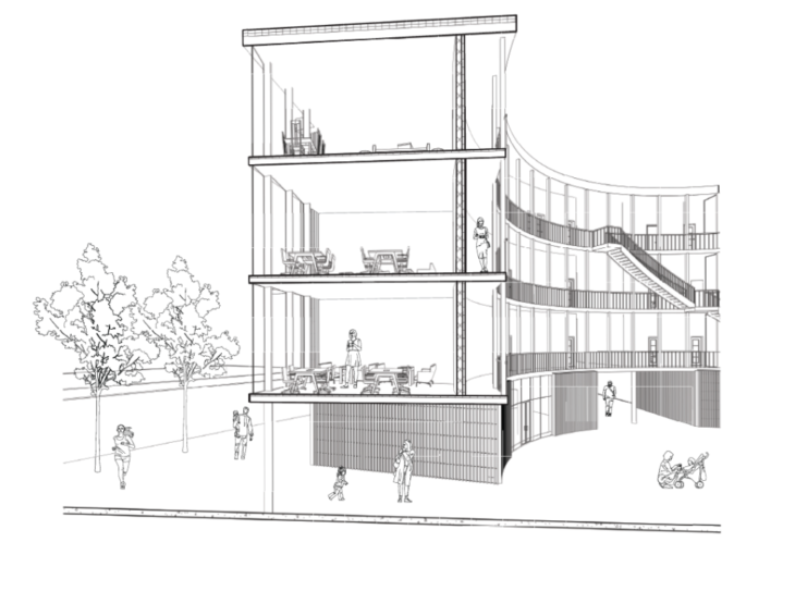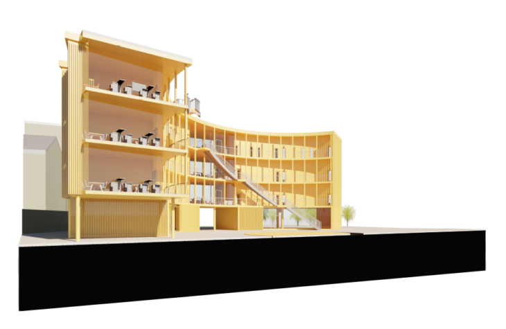 The ground floor plan of the project will incorporate the commercial and social aspects of the project. The Ground floor plan has been separated into 3 distinct areas with cut passageways separating them to allow for better circulation throughout the site. The ground floor consists of a cafe, a co-working office and a small library/ work area. A central timber deck feature will be situated in the middle of the structure to create a focal point for residents and citizens. The stairs to both the working professionals studios and student accommodation will wrap themselves in the structure and span from the ground floor to the third floor.