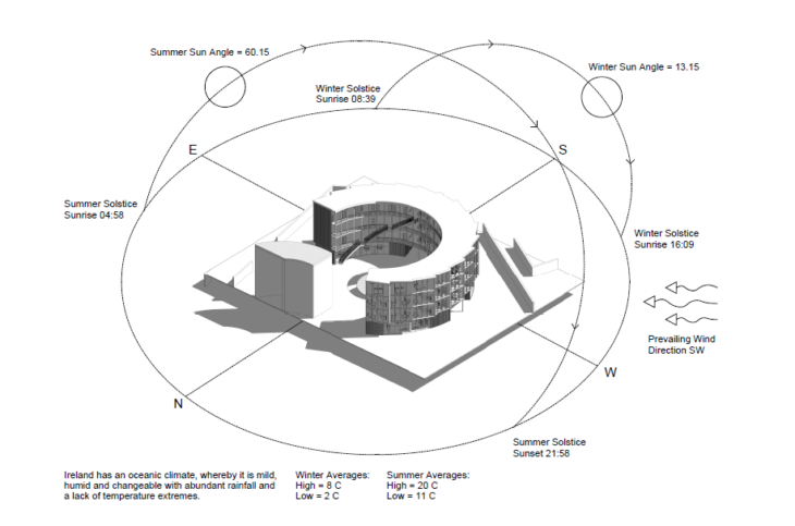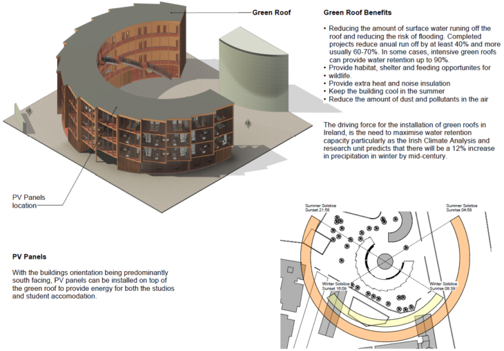 A number of environmental strategy’s are adopted in this project. The project has the capability to adopt both passive and mechanical ventilation strategies depending on how the occupants decide. Due to the large roof area and high rainfall in Ireland, a green roof is adopted in order to reduce the amount of surface water running off the roof and reducing the risk of flooding. Water attenuation tanks are adopted to store excess water run off that can be reused throughout the project to reduce the demand for water. The need to increase water retention stems from research by the Irish Climate Analysis, which predicts that there will be a 12% increase in precipitation in the winter by the mid century.