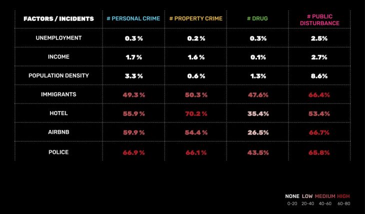 On the other hand, hotel and Airbnb overnights had medium to high correlation with personal crime, property crime and public disturbance. Hotel overnights showed high correlation with property crime while Airbnb overnights had high correlation with public disturbance.