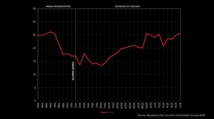 Crime in Barcelona has been increasing in the past two decades as shown in the victimization index. This coincides with the 1992 Olympic games and the rapid increase in tourists and visitors that followed. It is important to note that Barcelona was hugely successful in decreasing crime in the 1980’s thanks to the urban regeneration plan and the investments leading up to the Olympics. In 2017, the victimization index reached the same rate as the worst year of the 1980s. It is high time to re-examine urban policies to reduce crime in Barcelona taking into account of the phenomena associated with global cities and digital society.