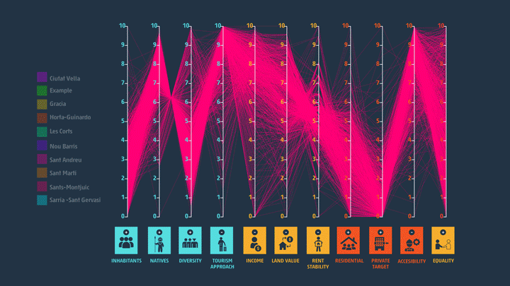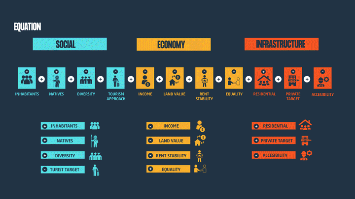 This phenomenon has led researchers to question the current model and propose a tool to develop policies considering the social value and specific conditions of a site. Collecting, classifying and visualizing data from a city population census and social networks such as Twitter, Airbnb, Foursquare and TripAdvisor in order to create dynamic simulations of the social conditions in the territory.