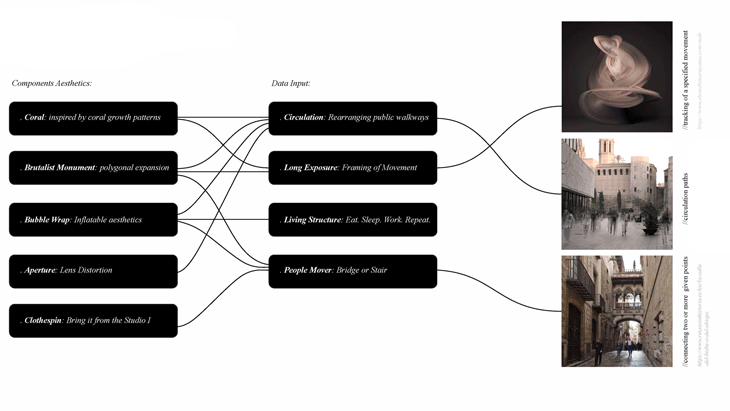 Data-Driven immediate Assembly is a project developed during the Software I Seminar of the MRAC-20/21. The course reveals the main differences from the conventional methods of architectural creation by focusing on the bottom-up approach. This project was driven by the idea of working with inflatable architecture. Starting with the smallest part of a structure shaped by a flexible membrane and some ridged couplers to allow for the aggregation of many similar discrete elements.