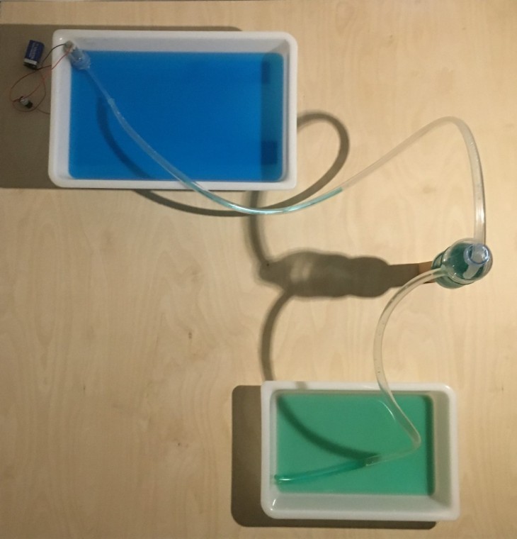 The intention was to move a matter using a single device without any human interaction. This process was created through the fabrication of a water pump fueled by a motor and battery. The pump was made from recycled materials and is efficient in transitioning the colored liquid from one basin to the next in a sequential manner. In addition, by beginning the experiment using two distinguishable colors of liquid, the pump was able to effectively alter the color from blue to green.