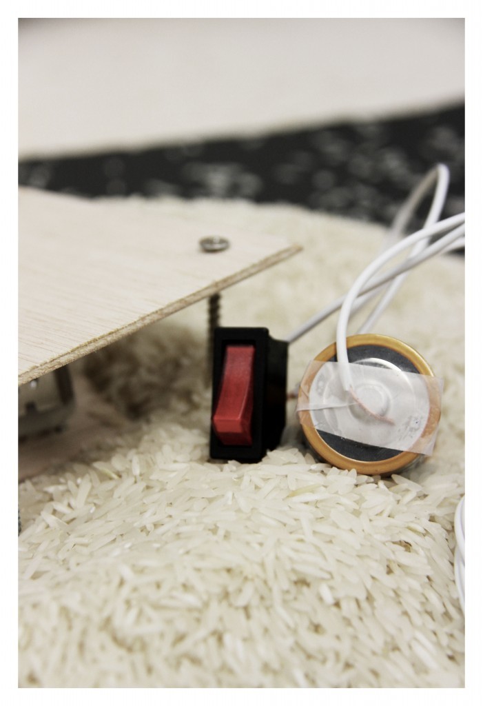 The final result – an automated mechanism for the displacement of rice, using the rhythmic rotations of a central motor and distribution panel.
