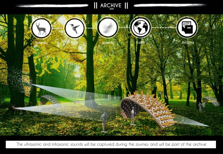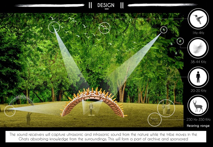 The prototype will move along with the tribe capturing sounds of nature and capturing every detail on the way from a leaf falling to the formulation of the products and research work performed in the course of their journey. It will be located along the exhibition spaces where the users will go through them experiencing the infra and ultrasound of the nature along with the journey of the tribe recorded before. This will expose them to a never before experienced treasure of natures audible just like the animals do in the night. The phrase ‘as deaf as a bat’ will apply to fellow humans and spaces will be experienced through hearing sense more.