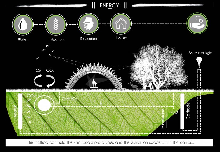 Electrons are a waste product of bacteria living around plant roots – plants excrete organic matter into the soil, which is broken down by bacteria. In the breakdown process electrons are released. It is possible to harvest them using inert electrodes and turn them into electricity, without affecting the plant’s growth in any way. This will help us to generate clean electricity around the world in any suitable wetland or wet area – including rice paddy fields, mangroves and salt marshes. This method can help the small scale prototypes, production lab and the exhibition space within the campus. The tubular system needs to be incorporated to generate electricity on a large scale which again needs no digging and is sustainable like other method.