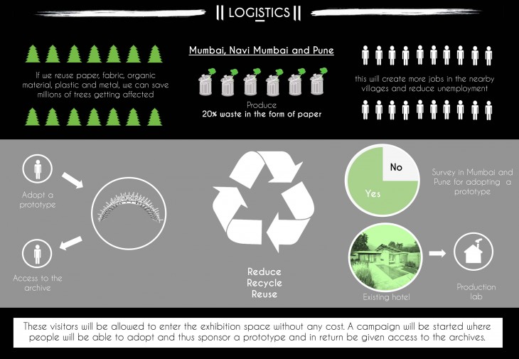 Mumbai, Navi Mumbai and Pune are around 110, 89.1 and 54.8 kms respectively from Shillim. This gives an added advantage considering the number of people coming from these cities for a weekend trip to this Oasis. Mumbai, Navi Mumbai and Pune produce around 20% of waste per year in the form of paper and cardboard. This paper can be recycled for the prototypes that need to be developed. The visitors instead of giving away get the waste paper to the site, it can be used for the construction of the prototype. These visitors will be allowed to enter the exhibition space and production lab without any cost. A campaign will be started where people will be able to adopt and thus sponsor a prototype and in return be given access to the archives of the respective prototypes thereby.
