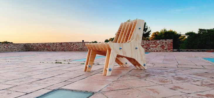 Optimos is a ready-to-assemble chair composed of CNC’d Baltic birch plywood, steel rod, wood spacers, and joint connectors. Among users of all ages and sizes, this project aims to create a robust standing chair that engages an enjoyable experience that allows users to sit in different positions. Inspired by the rocking horse that we used to ride when we were young, this chair is inspired by the configuration of rhinoceros or horses that have muscular shoulders and limbs. Vertically arranging plywood pieces makes the chair even strong to work under a wide range of loads from compression. With the consideration of ergonomics, the chair was designed with an embracing curvature for the hip from outer pieces to the middle ones. The chair’s appearance changes from angle to angle and has subtle difference hidden throughout all the straight lines. The extended back edge allows users to put their arm onto it to stretch or to put books temporarily. Lastly, the chair is called Optimos to recall the sense of instinctive strength.