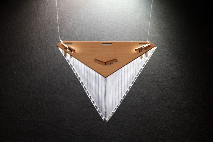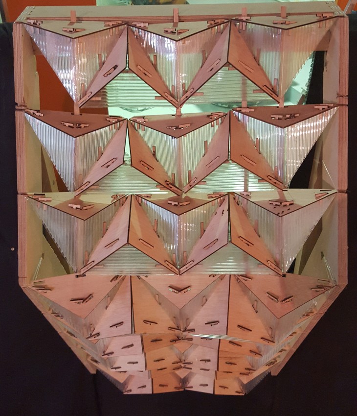 To contruct the facade we have 1 basic tiangular pyramidal formand 2 versions of the form of varying materials. We implemented Rhino software to facilitate and articulate the design before creating sectional prototypes. Once the design was succesful in theory we created a protoype to confirm joinery and construction methods, we proceeded to hand cut the polycarbonate and laser cut the wood. The facade is constructed of 3mm wood and 5mm polycarbonate throughout.The joinery pins consist of 5-6mm wood. After both materials were cut, we proceeded to connect the components using “T-pins” which were then inserted throught the wood and into the structural component of the polycarbonte creating a pyramidal form emphasizing the structural strength elements of the triangular shape.