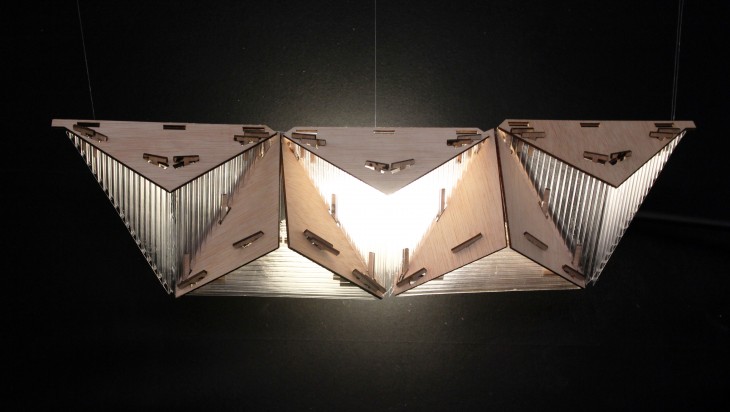 - Strategicaly arranged pyramidal forms are arrayed in a repititional pattern so that one or two sides are wood and the remaining side(s) is polycarbonate combined with a unique fastening system which re- quire embedding pins into the polycarbonate’s form.