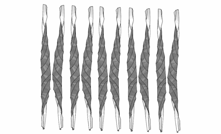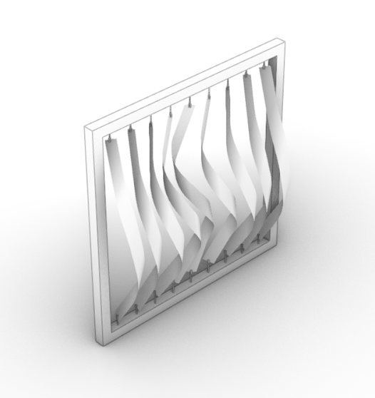The fabricated prototype offers a 1:5 scale mockup of the louvers on the façade. Not derived from the geometry of the architectural design directly, the prototype instead depicts a gradient of increasing manipulation and thus twisting. This gradual increase in crease density highlights the potential for manipulation whilst working in this smaller scale.