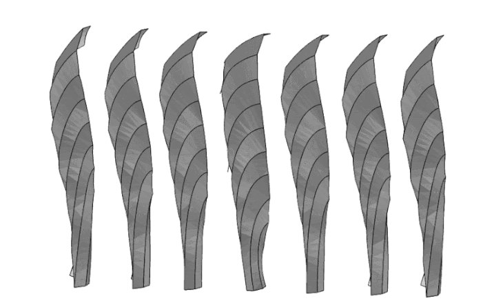 1. Strips with 10 curves and 15 curves are relatively identical to the design strip (Kangaroo Simulation model) in creasing bend angles and overall strip bending. Reference images above