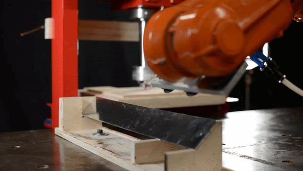 The above experiment assisted in understanding the limits to which we can extend our setup. Higher pressure gave a highly intense crease >10 degrees bend, but the pull pressure required to drive the strip along the creasing curve under this high pressure exceeded the robotic arm’s payload range. I.e. >6 kg.