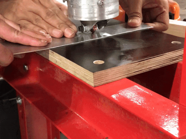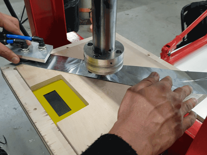 A custom made aluminum adapter was fabricated and fixed under the press cylinder. As the strip is fed under the cylinder, the wheel starts to roll and the metal strip creases as it passes through.