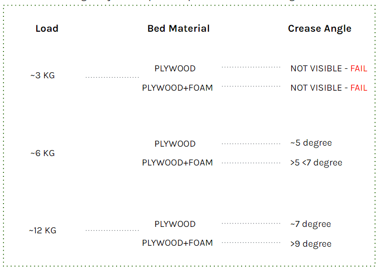 - A foam base gives a higher crease angle – approx. 7° at ~6kg hydraulic press load – whereas a plywood base resulted in ~5° at the same press load. However, due to friction, the pull/push required with the foam base was higher than plywood base setup.