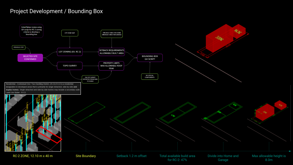 The next step takes the selected site, inputs data from the zoning. So for example, this piece of land in the Capitol Hill neighbourhood in Calgary is RC-2 zoning for low rise low density residential. A bounding box is created automatically for the maximum extents of what can be built on this land using a custom script in GH created as part of this project.