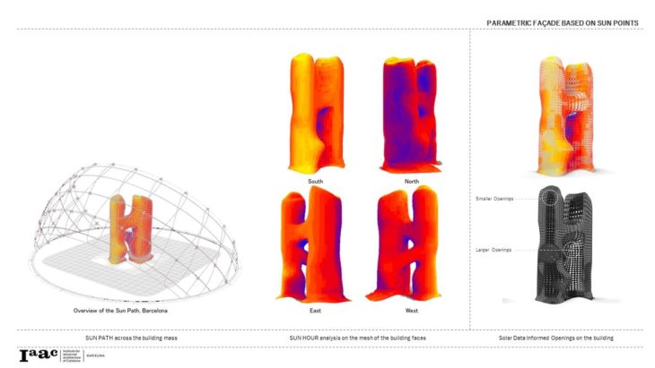 Using Ladybug in Grasshopper and selecting Barcelona for the climatic data, the perforation on the face of the building was generated. The parameter taken into account for this generation was the average annual sun hours striking the faces of the volume. By “Chasing the Light”, a domain for larger and smaller openings were set based on the sun point mesh generated by the solar analysis. Regions receiving lesser sun exposure have larger openings and vice versa.