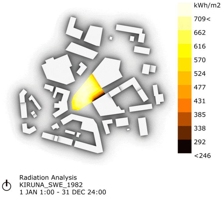 The site chosen for our design is an empty square in downtown Kiruna. To design the initial volume, we decided to maximize the radiation it receives and the amount of natural light that hits the facades. All this while maximizing the volume/area ratio. For this, we set three volumetric operations: tilt angle, outline simplification and rounded corners, and use an evolutionary solver to find the most suitable option.