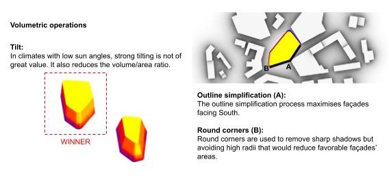 We found out that tilt angle in climates with such low sun angles does not play a major role and that the outline simplification process maximized areas facing the South. Also, rounded corners are used to avoid sharp shadows and self-shading but kept to small radii to avoid reducing favorable facade’s area.