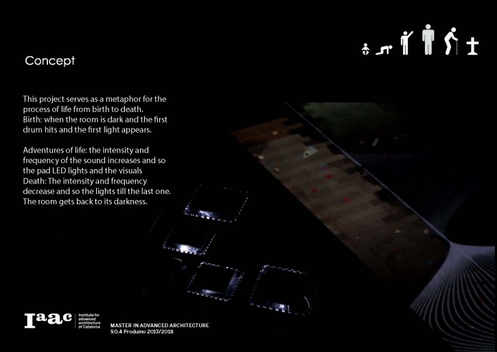 The setting for this project begins in a dark room with different colored lights flashing on and off in response to the symphony of drum pads projecting a range of beats with different notes and intensities.
