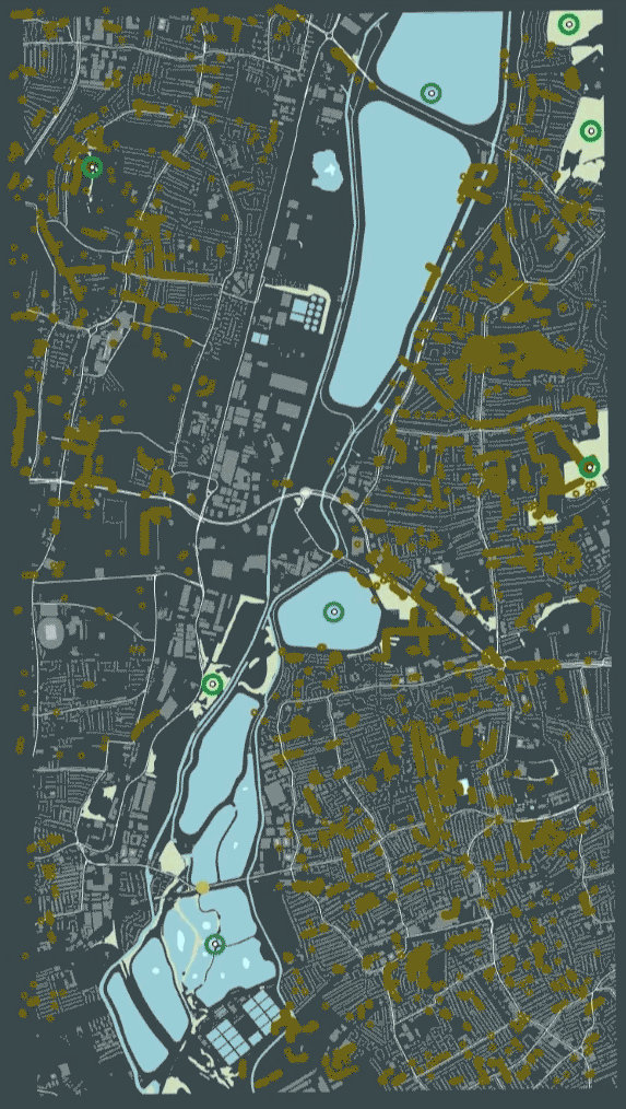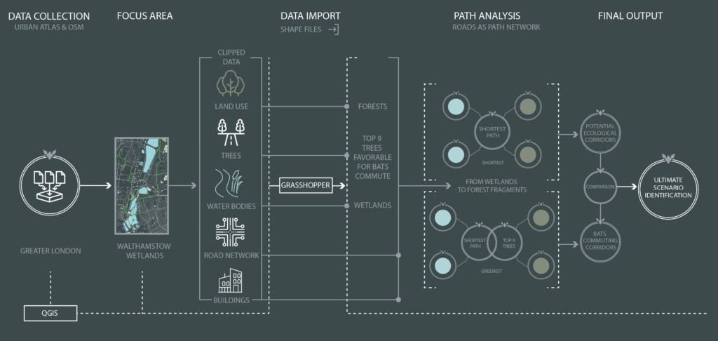 [ECHO]nnect WALTHAMSTOW project studies and visualizes humans and bats movements along the Walthamstow Wetlands area. This ecological connectivity will result from both the shortest and greenest paths. It potentially links three key wetlands locations to each forest fragment in proximity – consequently redefining the once-thriving ecological corridor.METHODOLOGY | PSEUDOCODE