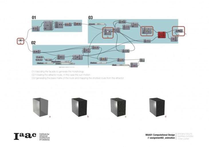 Above pictures are the grasshopper script to explain the processing of generating the efficient route mapping on the referred geometry. In the following video, it has more detail explanation that how the facade system response to the sun movement. To be noticed, in this practice, the sun movement does not refer to the realistic location.