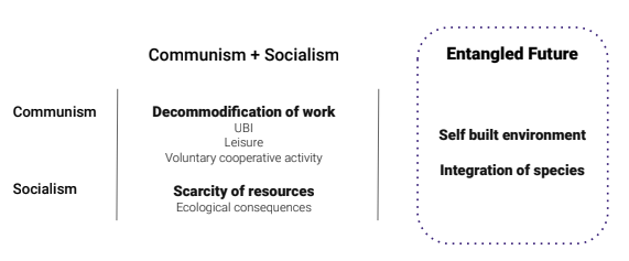 The starting point of the research is a scenario where increasing automation has led to the decommodification of work through the institution of an UBI, allowing for finding new meaning in a life that is not centered around waged work. Getting past wage labor will require changes in priorities and the values our lives revolve around. (Frase, “Four Futures: Life After Capitalism”, 33) Freed from the need to work for wages, it will be possible to explore what it means to take care of ourselves and one another and as a consequence certain activity will become the result of voluntary cooperation. (Frase, “Four Futures: Life After Capitalism”, 41). To avoid portraying a utopia, the constraints of scarcity and the ecological devastation are also characteristics that set the framework of the scenario, raising the question of how to work out a new relationship between people and their environment. The scenario being presented in this research paper will now be referred to as “the entangled future”.