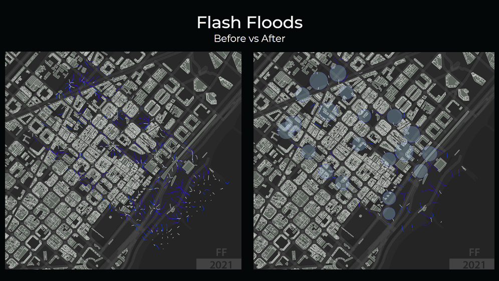 Flash floods are most of the time caused by rivers, basins, and irregular rains, which the focus here is the water runoff of flash floods caused by irregular rains. As part of our analysis we made. For the analysis what we did is that take elevation data of the site in Rambla De Poblenou and applied buildings layers plus gravity, from there the slope and of the land has been analyzed with and produced a grid which calculated risk areas and heat map to visualize then with visualization done with the length of the water runoff. From there the two visualizations happened, based on grid data and heatmap the sponge nodes (which is the strategy to propose delay, protect, store and release on time) had been allocated on risk areas to evaluate the solution.